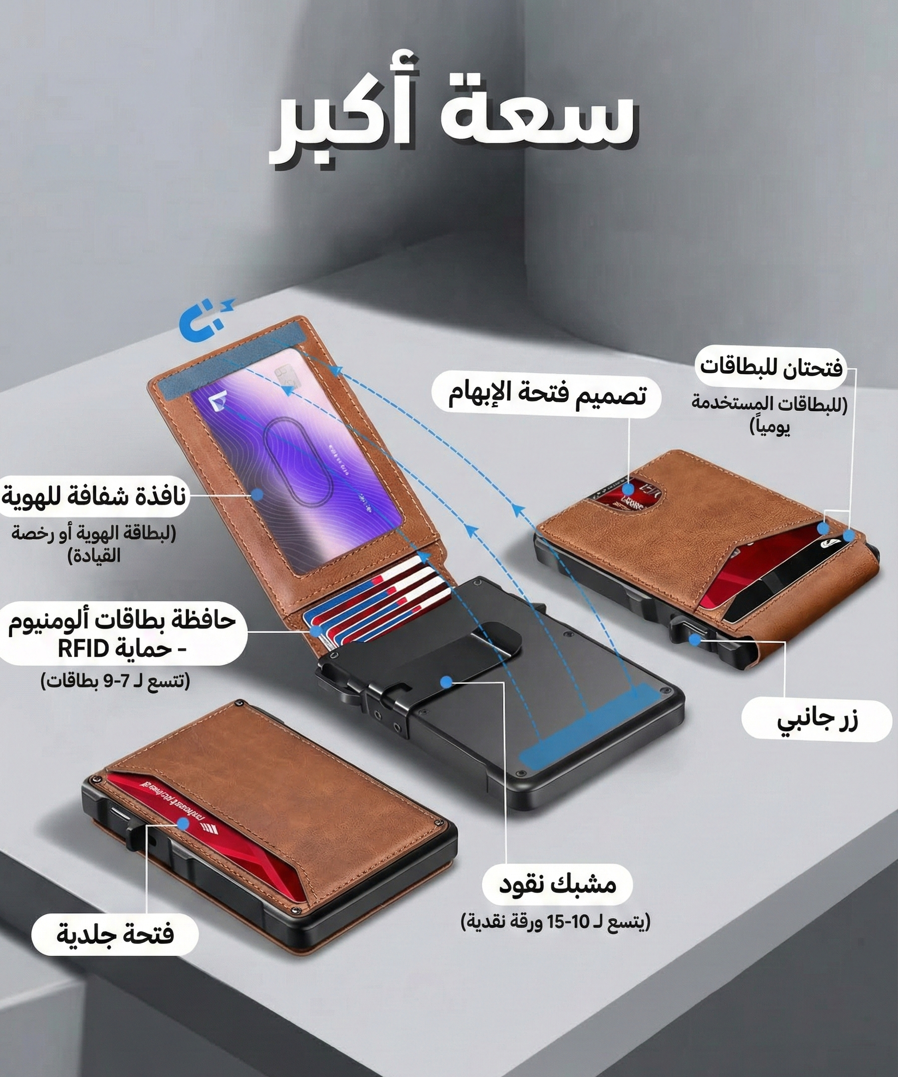 نحيف بس يشيل كثير: تصميم خفيف بالجيبة، بس بيوسع حتى 15 بطاقة وكاش بدون ما يعطي شكل جيبة منفوخ